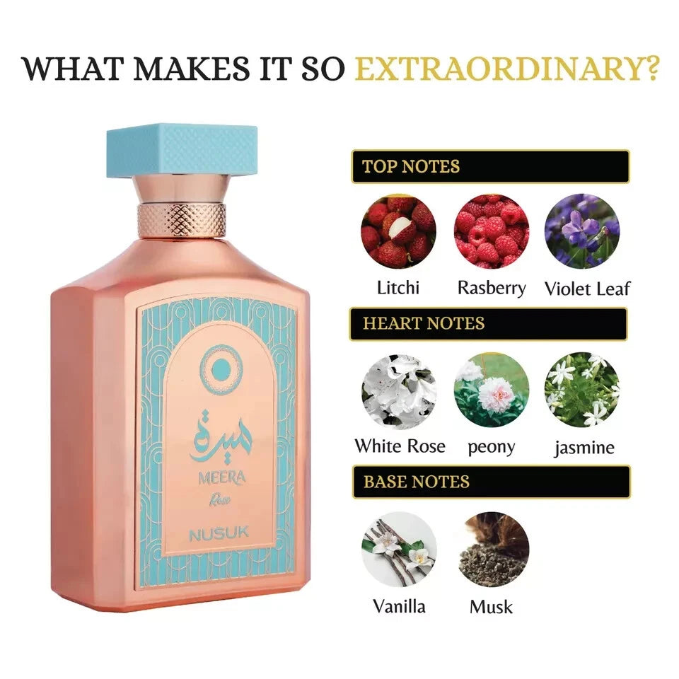 Meera Rose is a luxurious fragrance that highlights the beauty of rose with a modern, refined twist. Fresh florals open into a radiant rose heart, while warm, sensual undertones provide depth and lasting allure.
